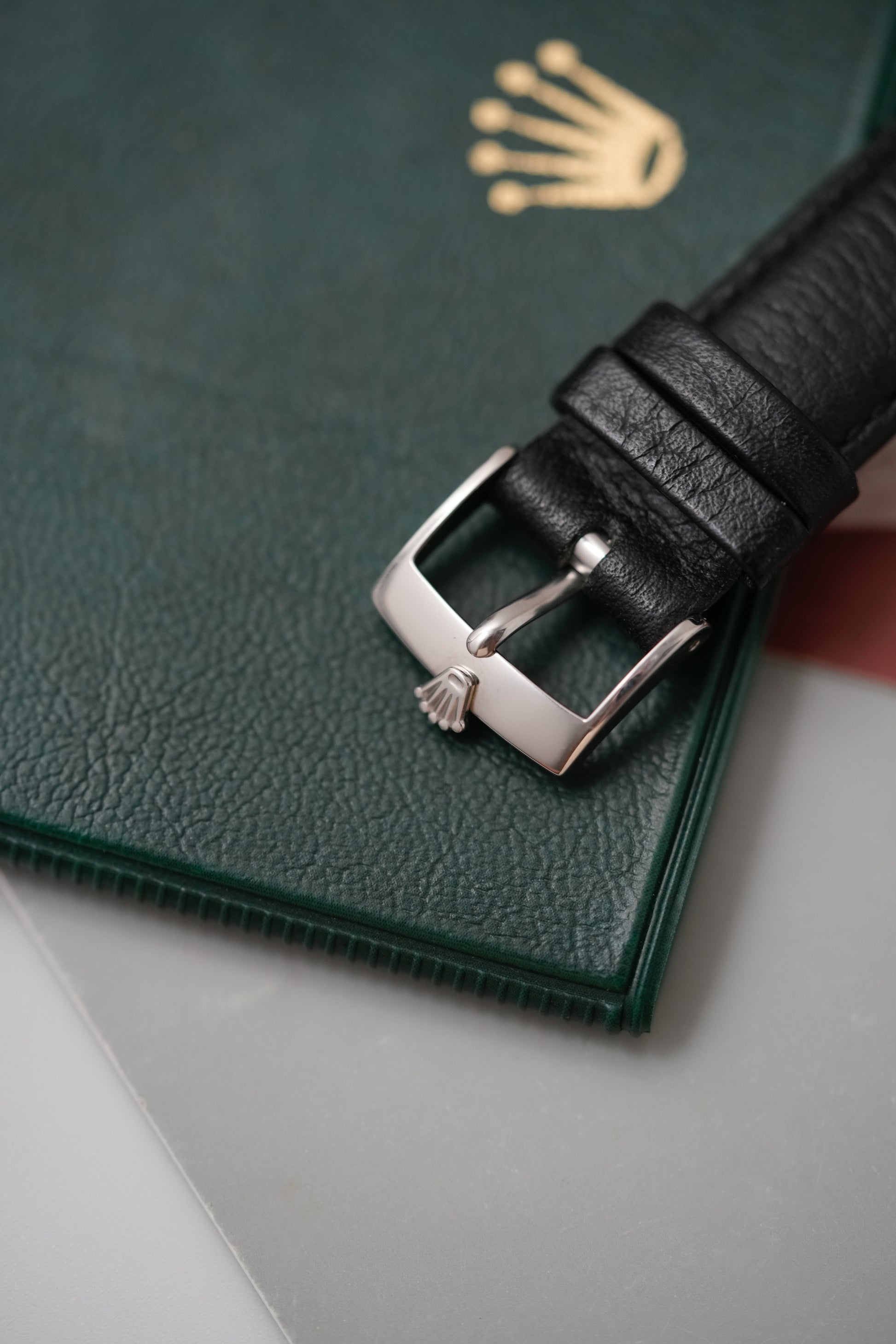 Provided on a beautiful and classic Italian black calf leather strap of the softest hides and an original Rolex stainless steel buckle.