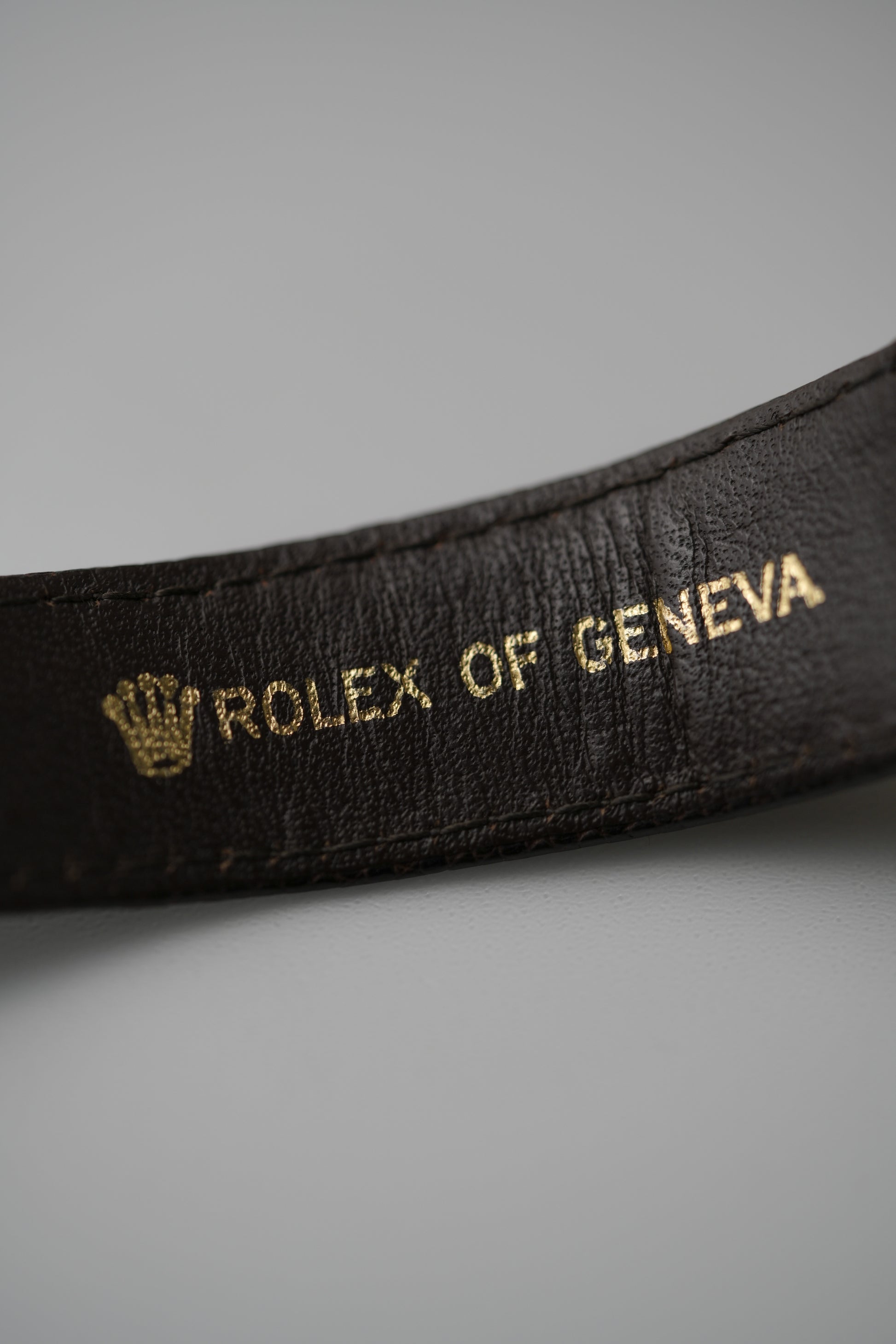 Sharp, unpolished vintage condition with with dial having developed a nice, lighter tone of gold. Hallmarks are prominent. The watch is provided with the factory brown lizard leather strap and gold buckle.