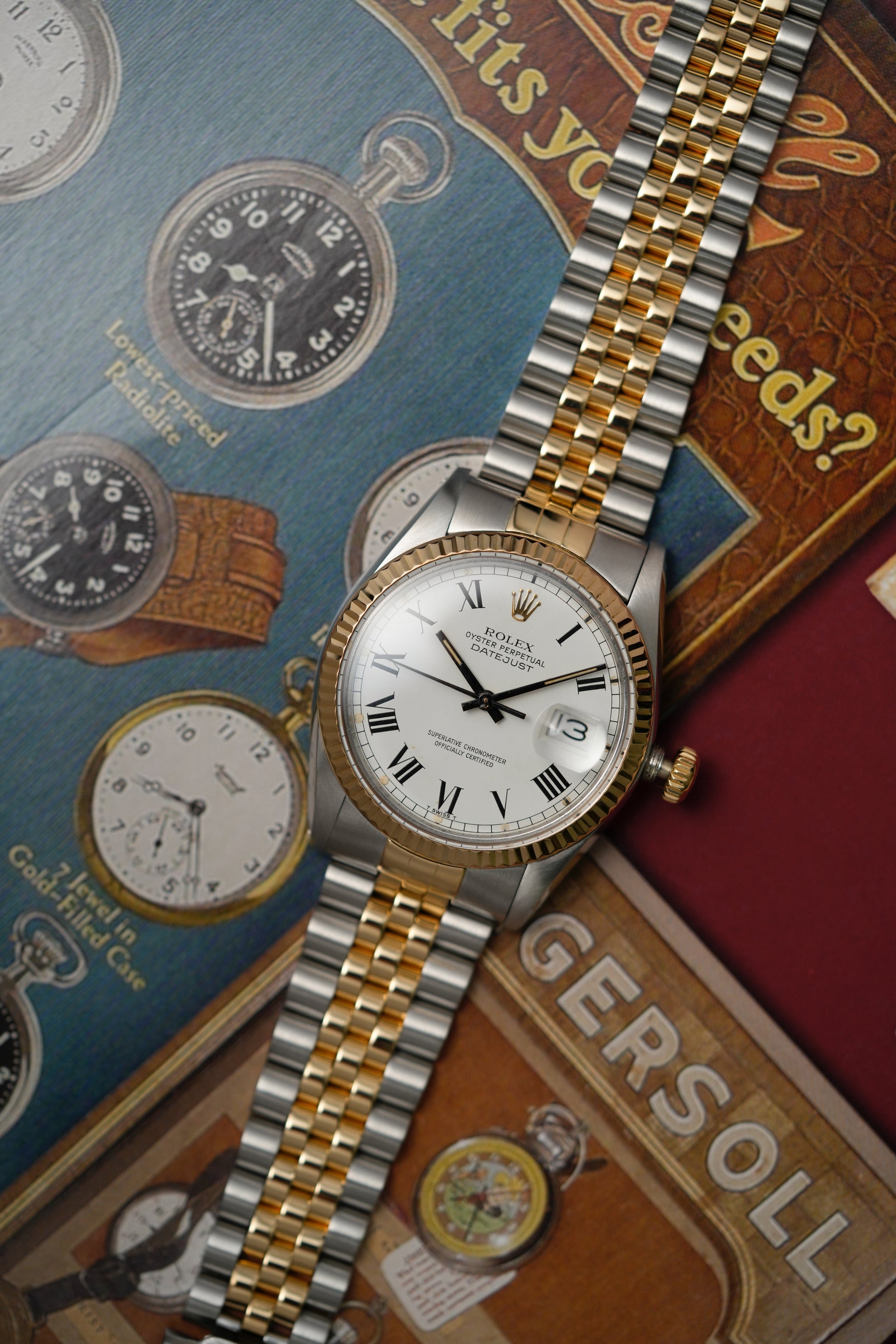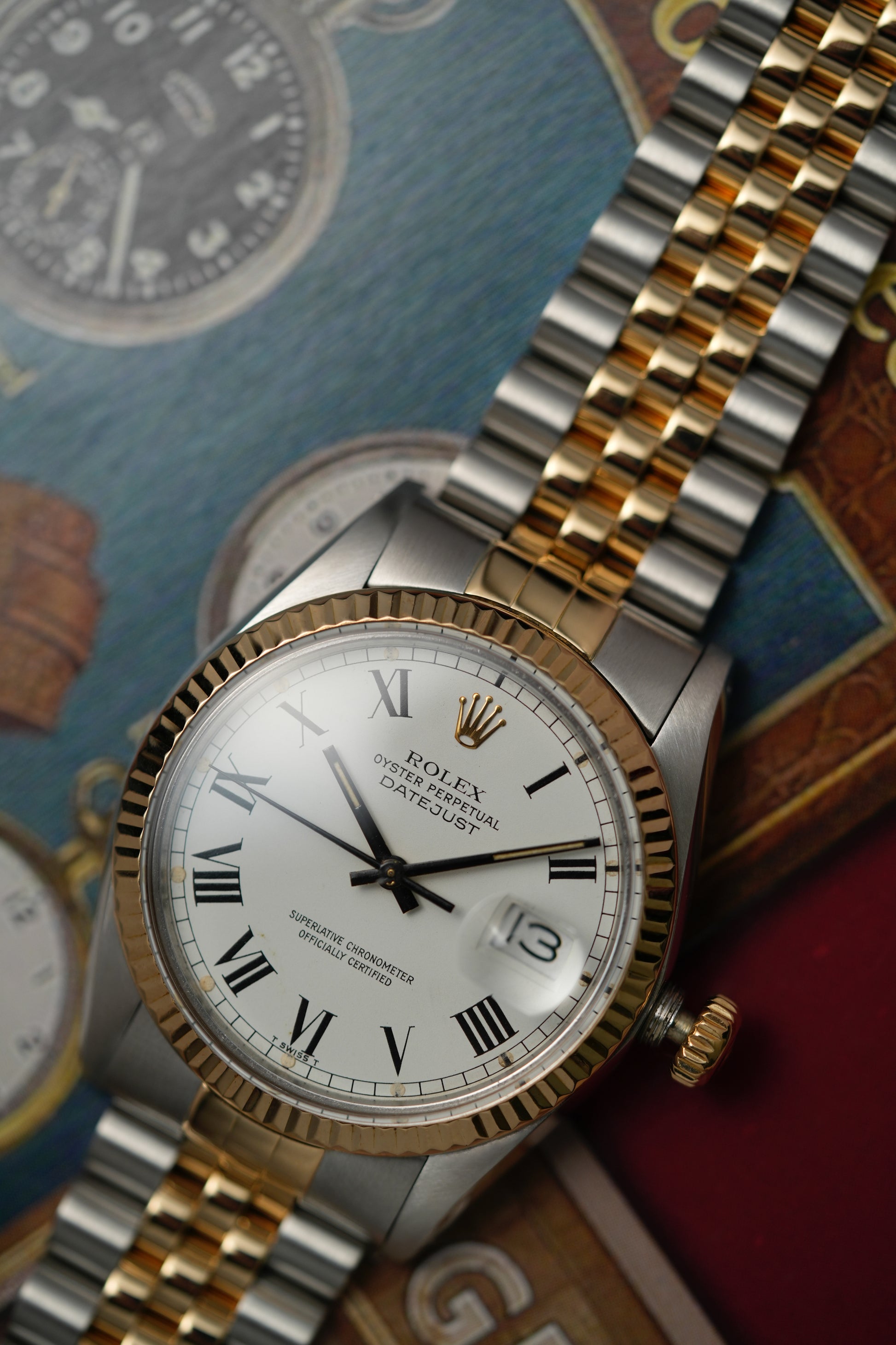 1986 Rolex Datejust Ref. 16013 – 36mm featuring a white Buckley dial.