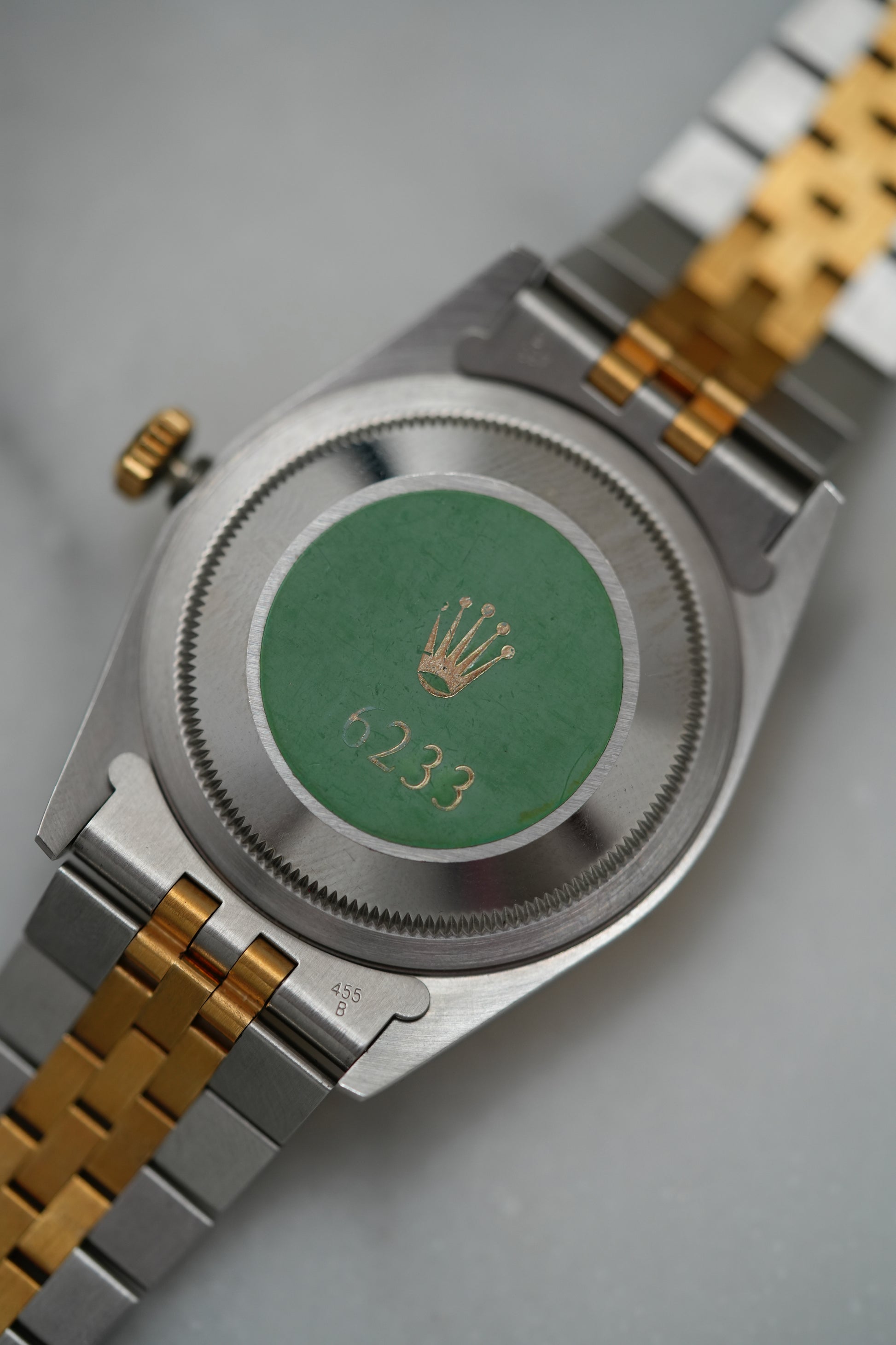 One of the finest 'E' serial Datejusts to have come across in new/old stock condition with the factory green sticker on the caseback bearing the reference number. Serviced by Rolex.