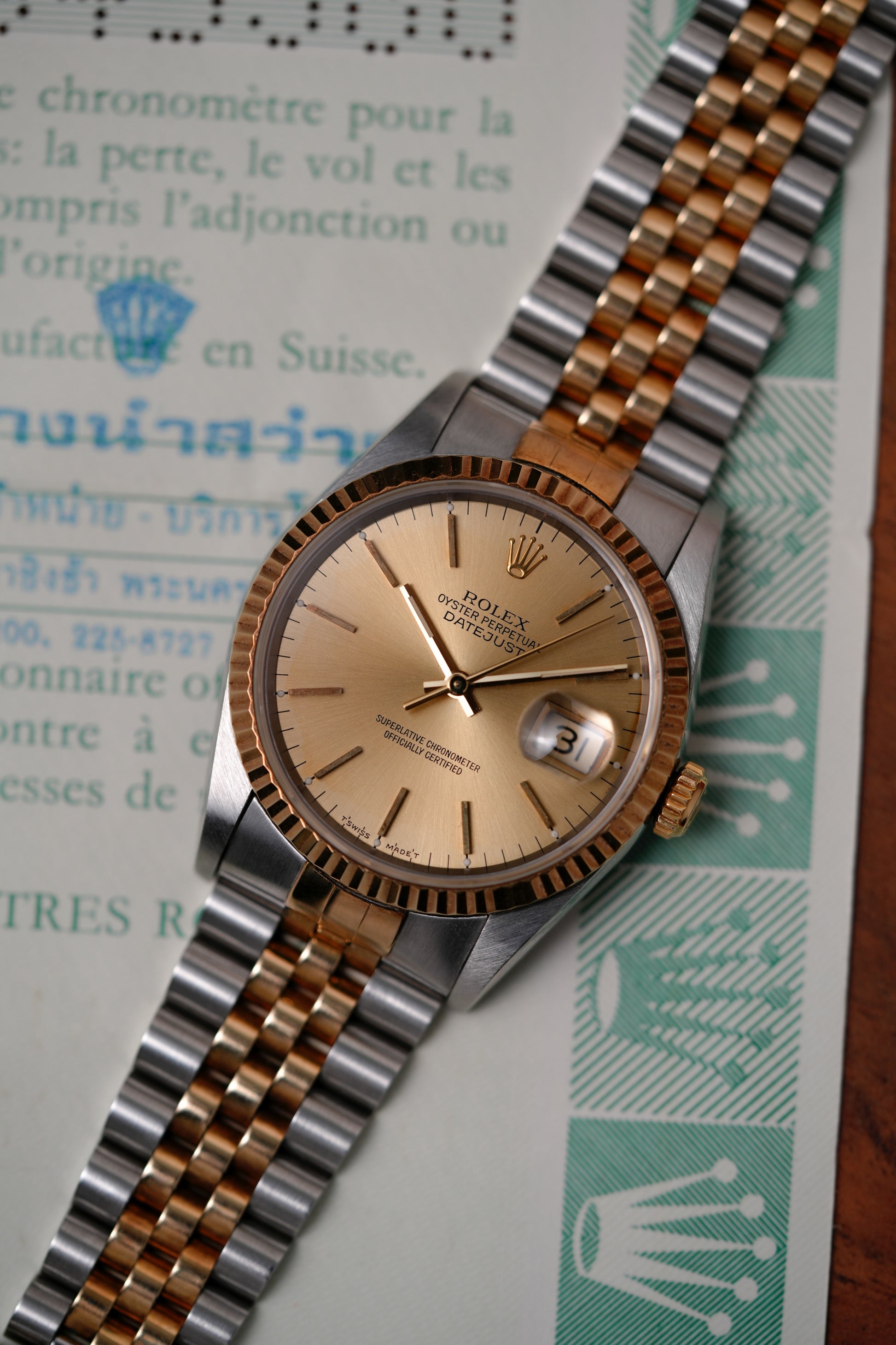 1991 Rolex Datejust Ref. 16233 – 36mm featuring a champagne dial.
