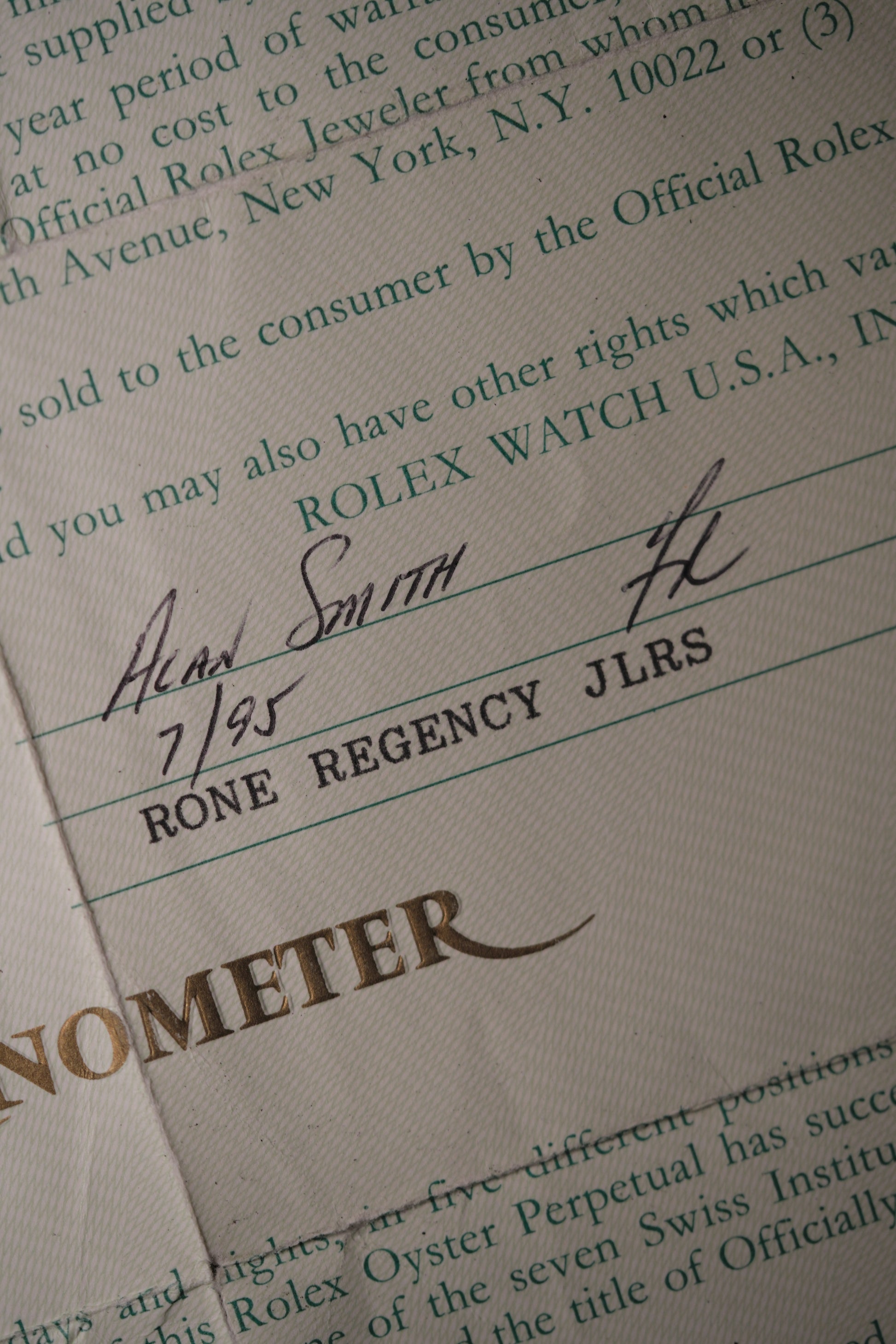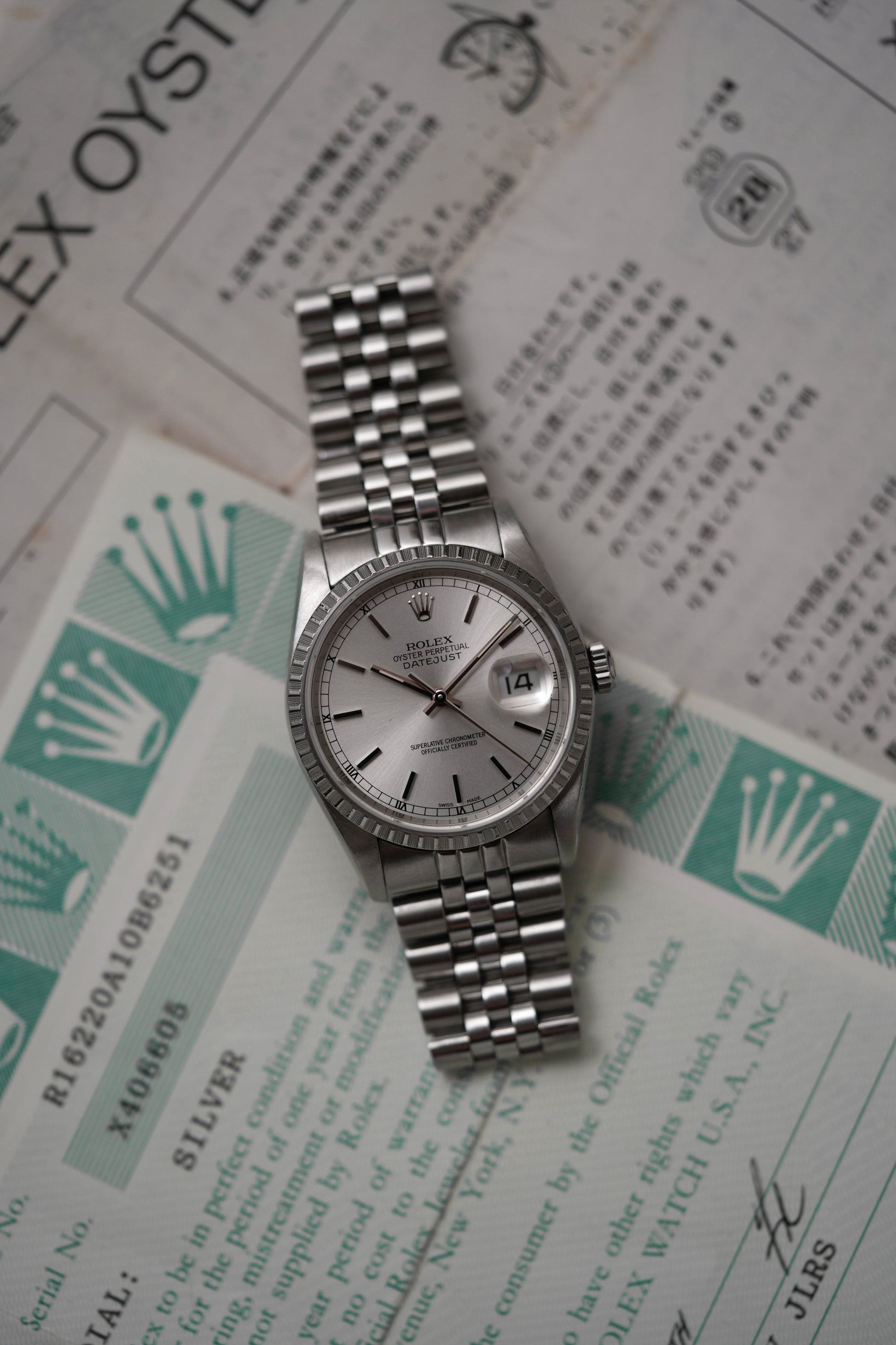 Beautiful vintage ever-green Datejust. Originally Purchased by Mr. Alan Smith at Rone Regency Jewellers, Tennessee, United States in July, 1995. The color of the dial has been stamped on the papers, as often seen on U.S. Market Rolex watches.