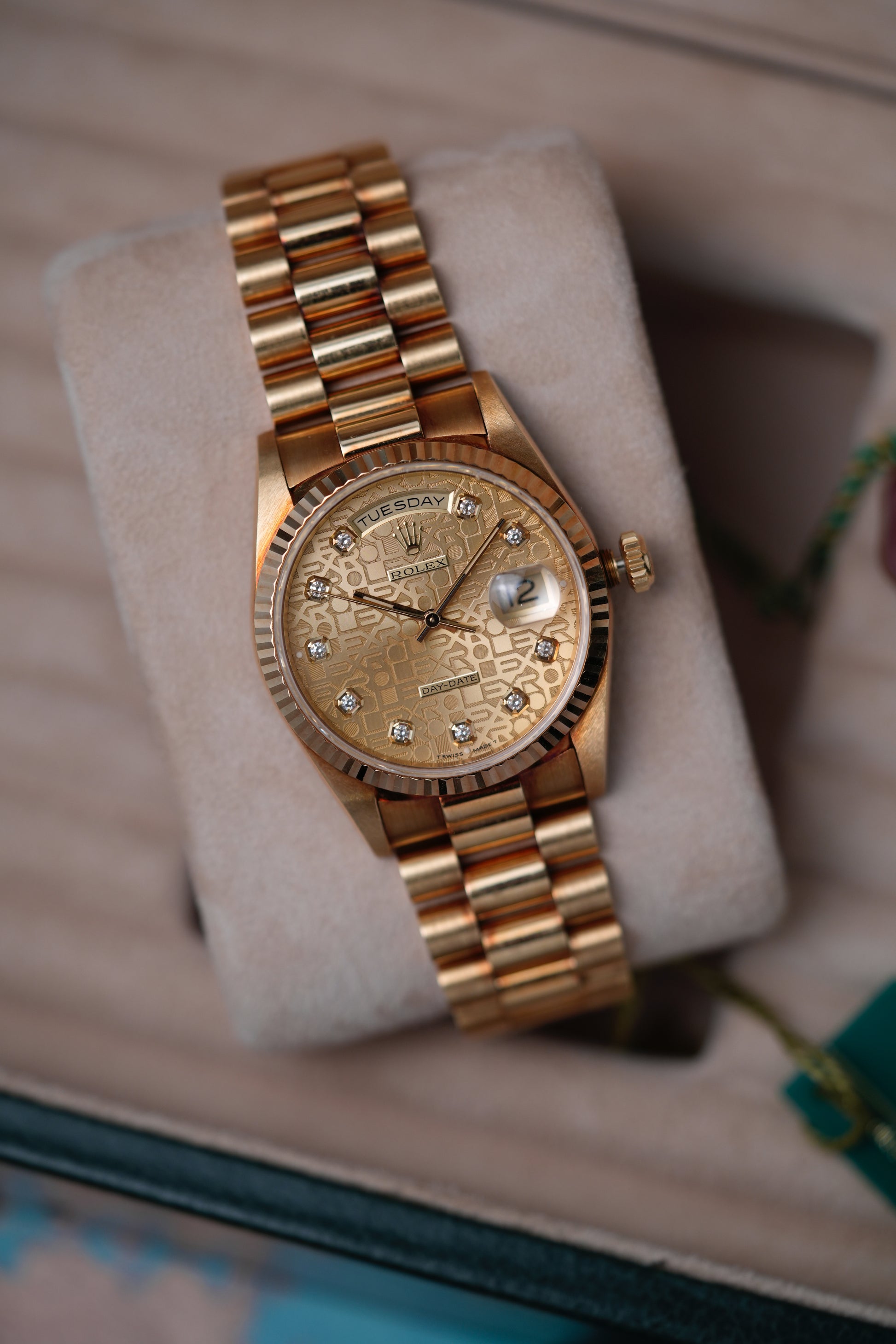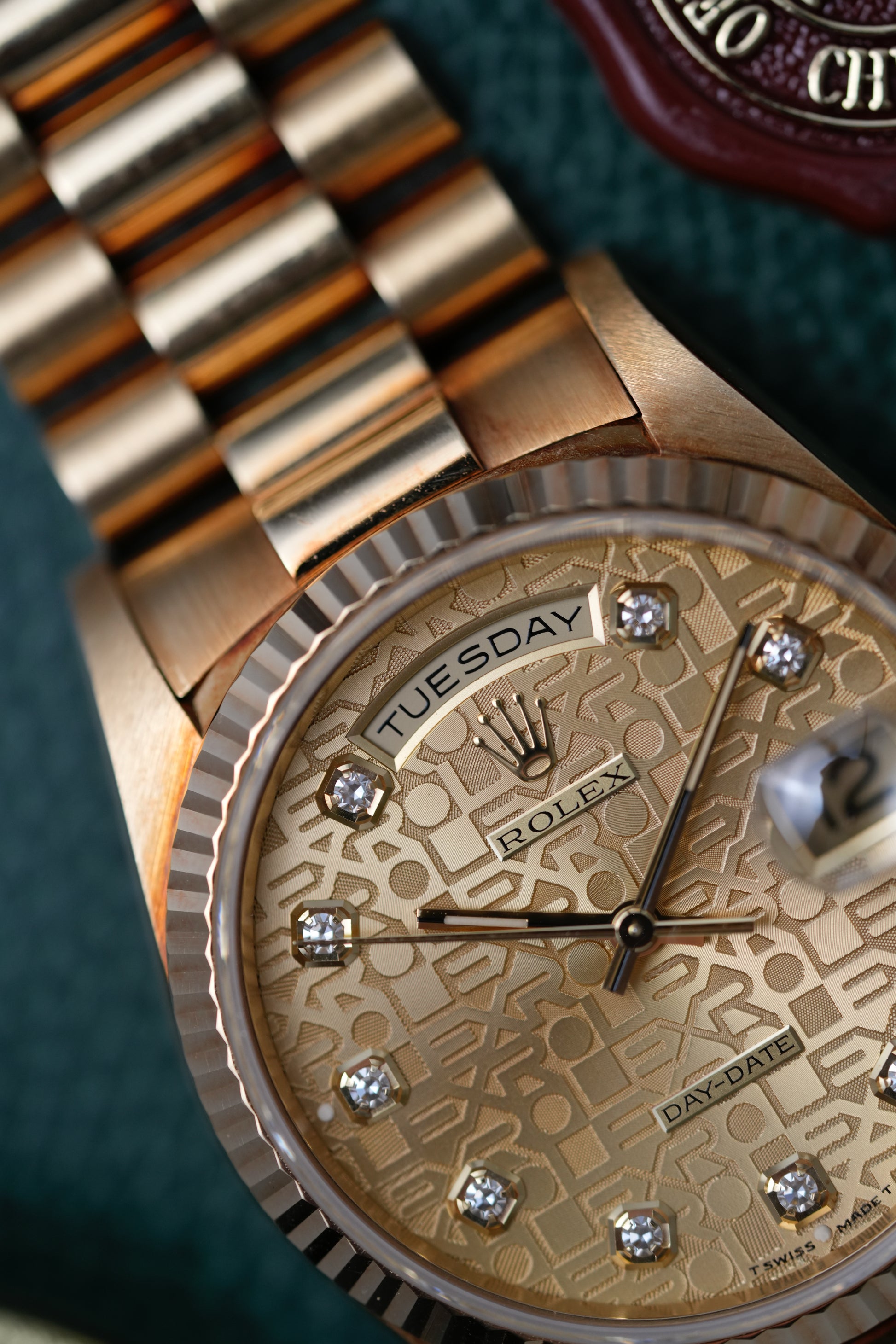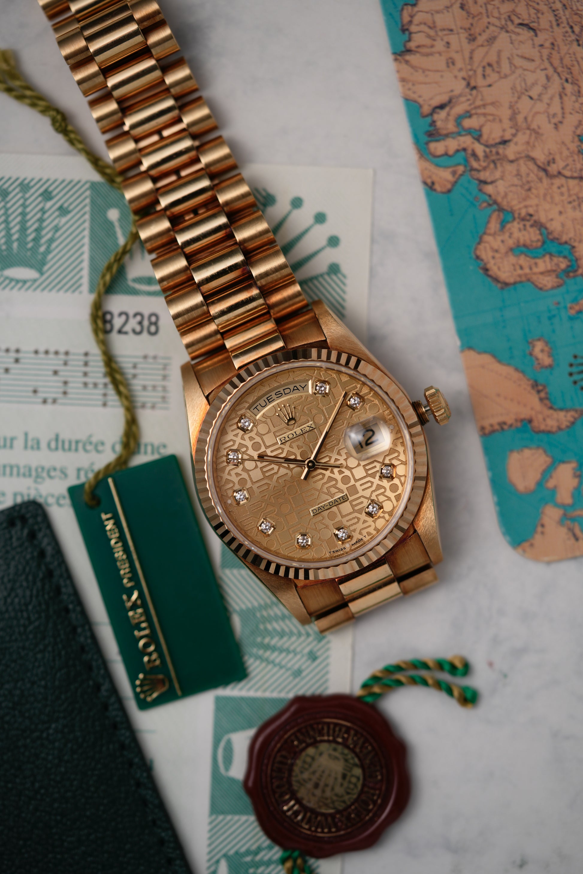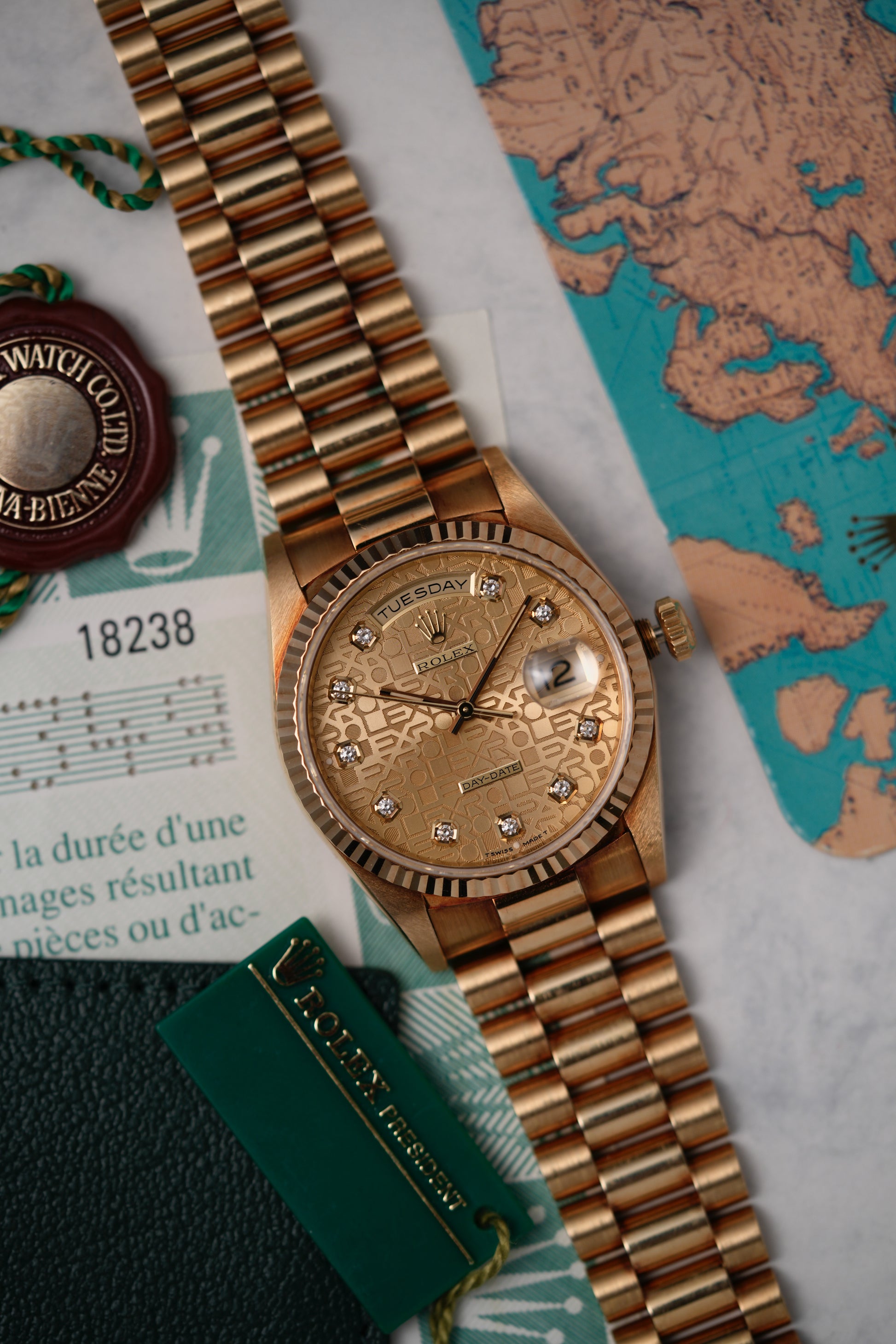 1995 Rolex Day-Date "President" Ref. 18238 – 36mm featuring an anniversary champagne big diamond dial.