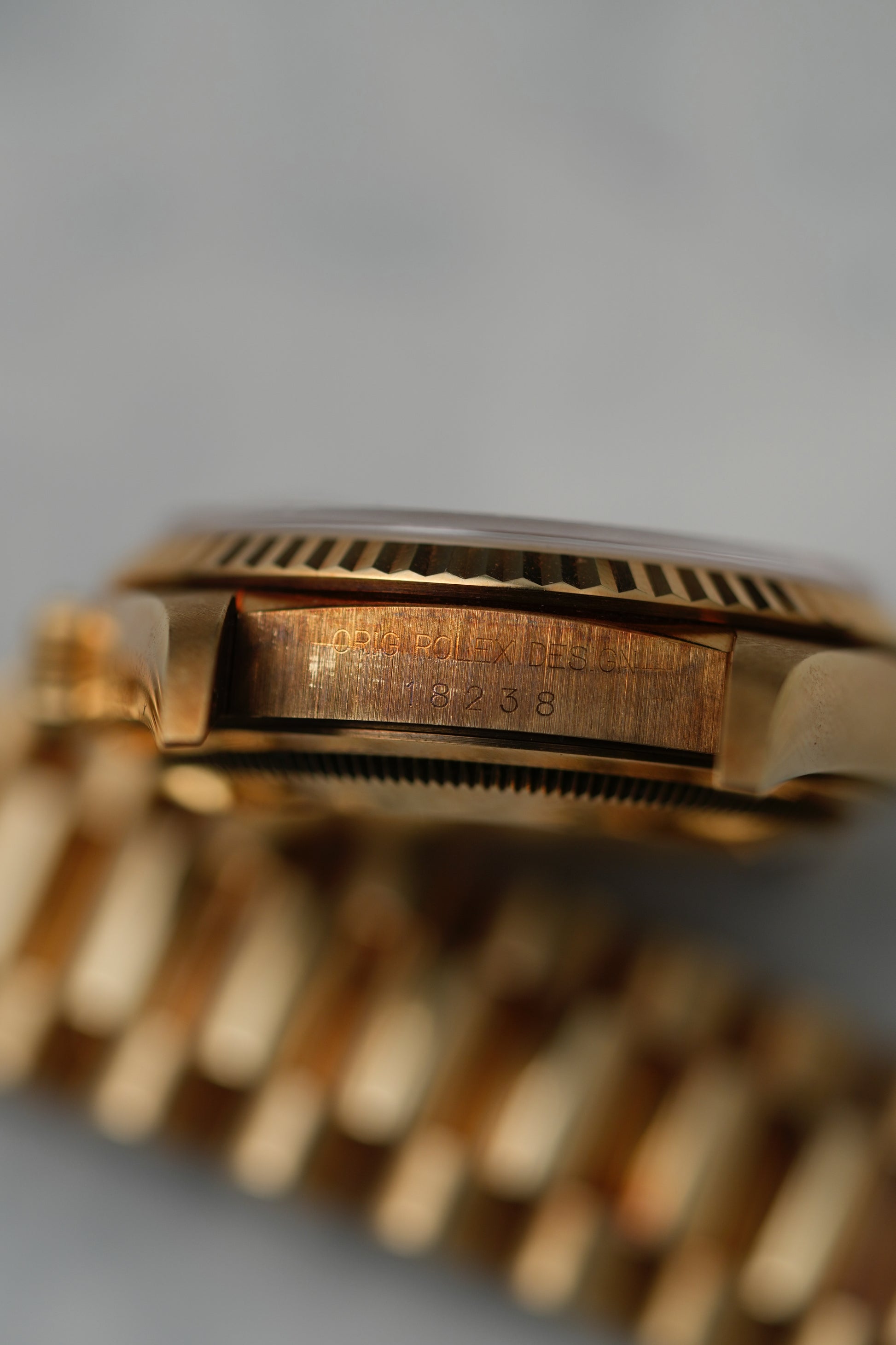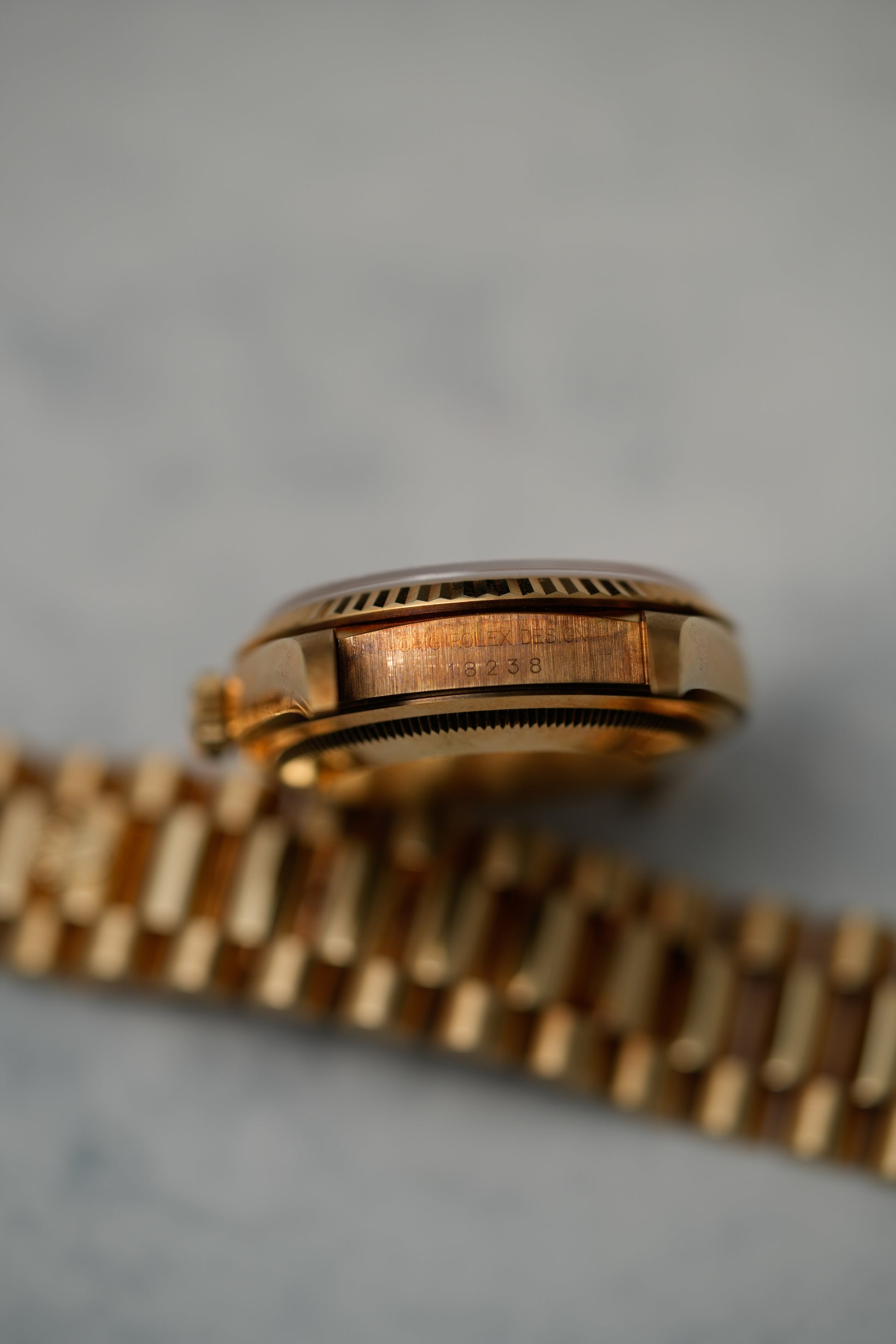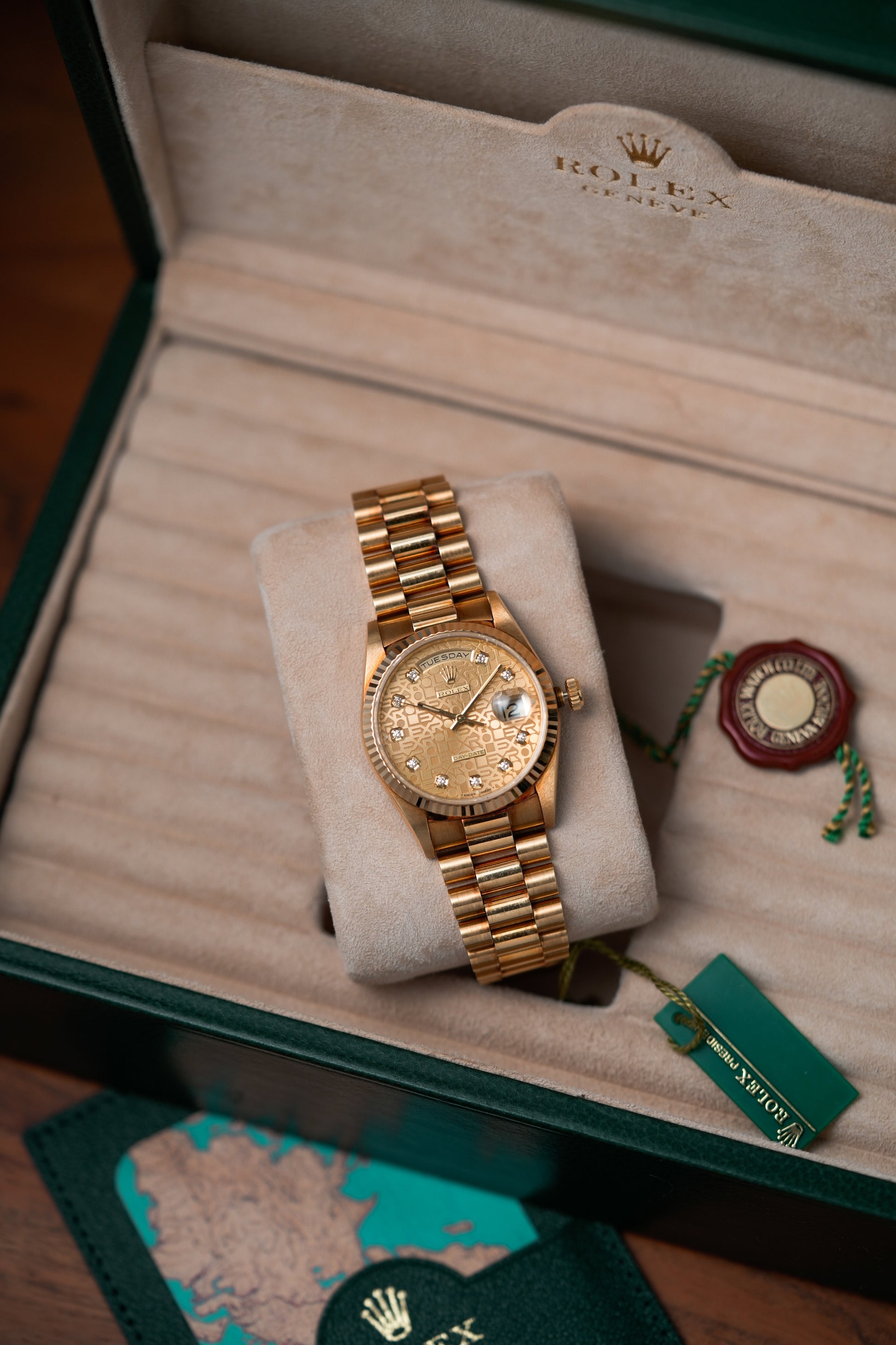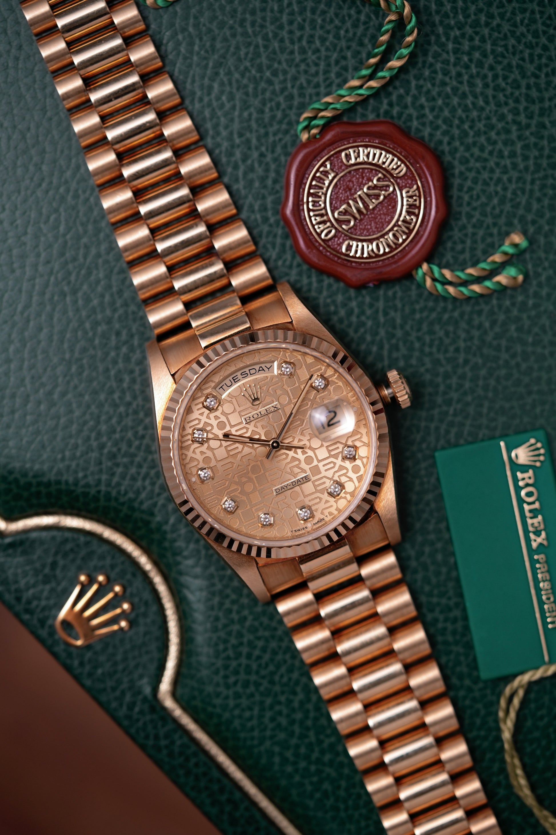 1995 Rolex Day-Date "President" Ref. 18238 – 36mm featuring an anniversary champagne big diamond dial.