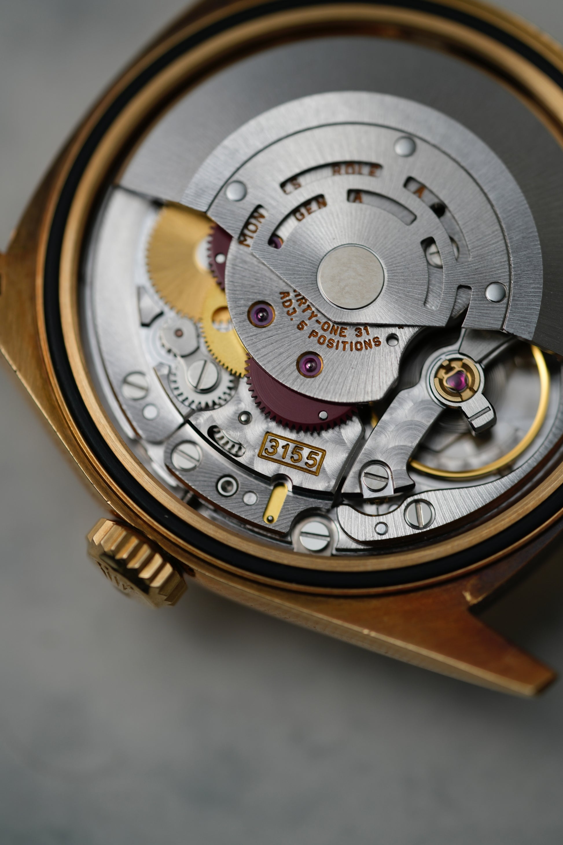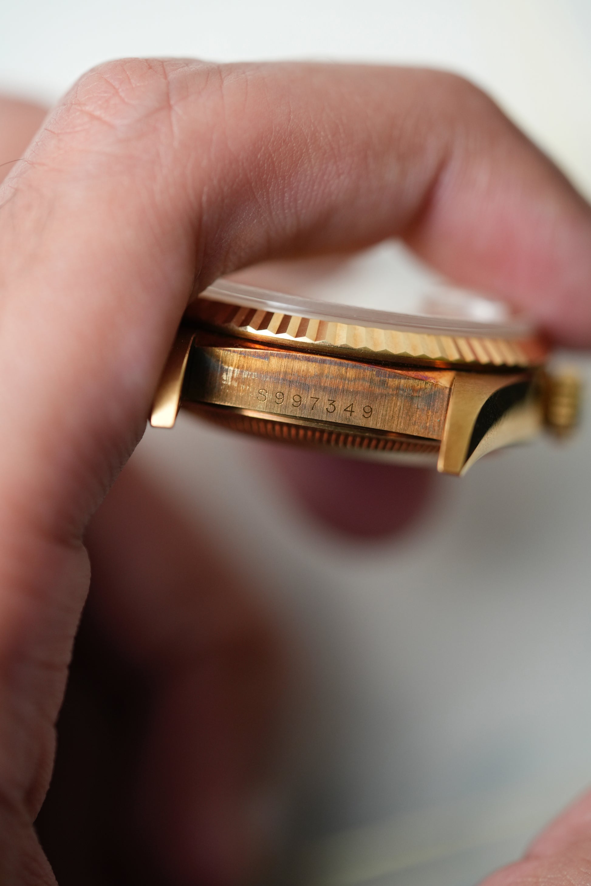 Outstanding specimen. Unpolished and untouched. Splendid rose gold oxidisation on the case. English day and date complication. Serviced.