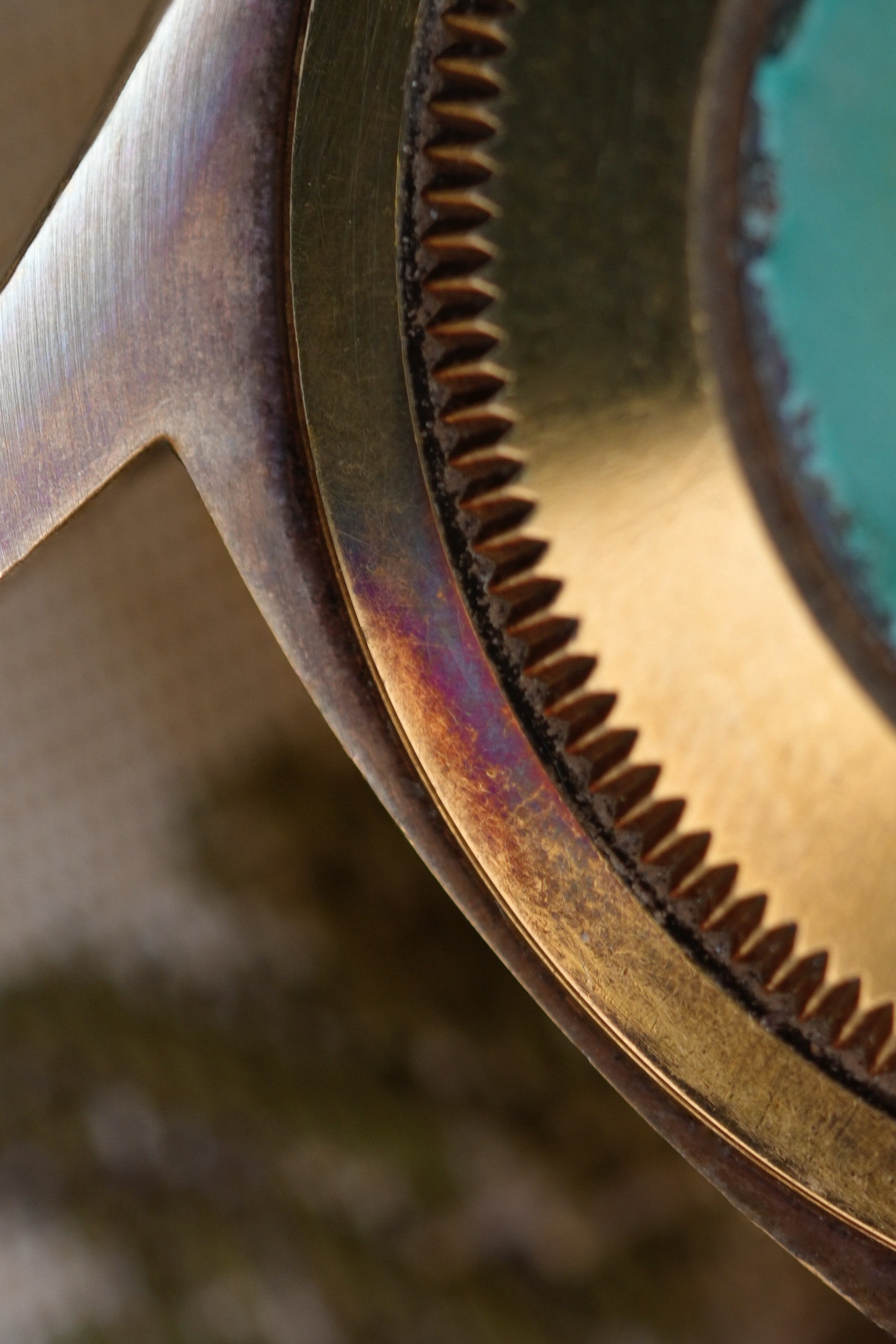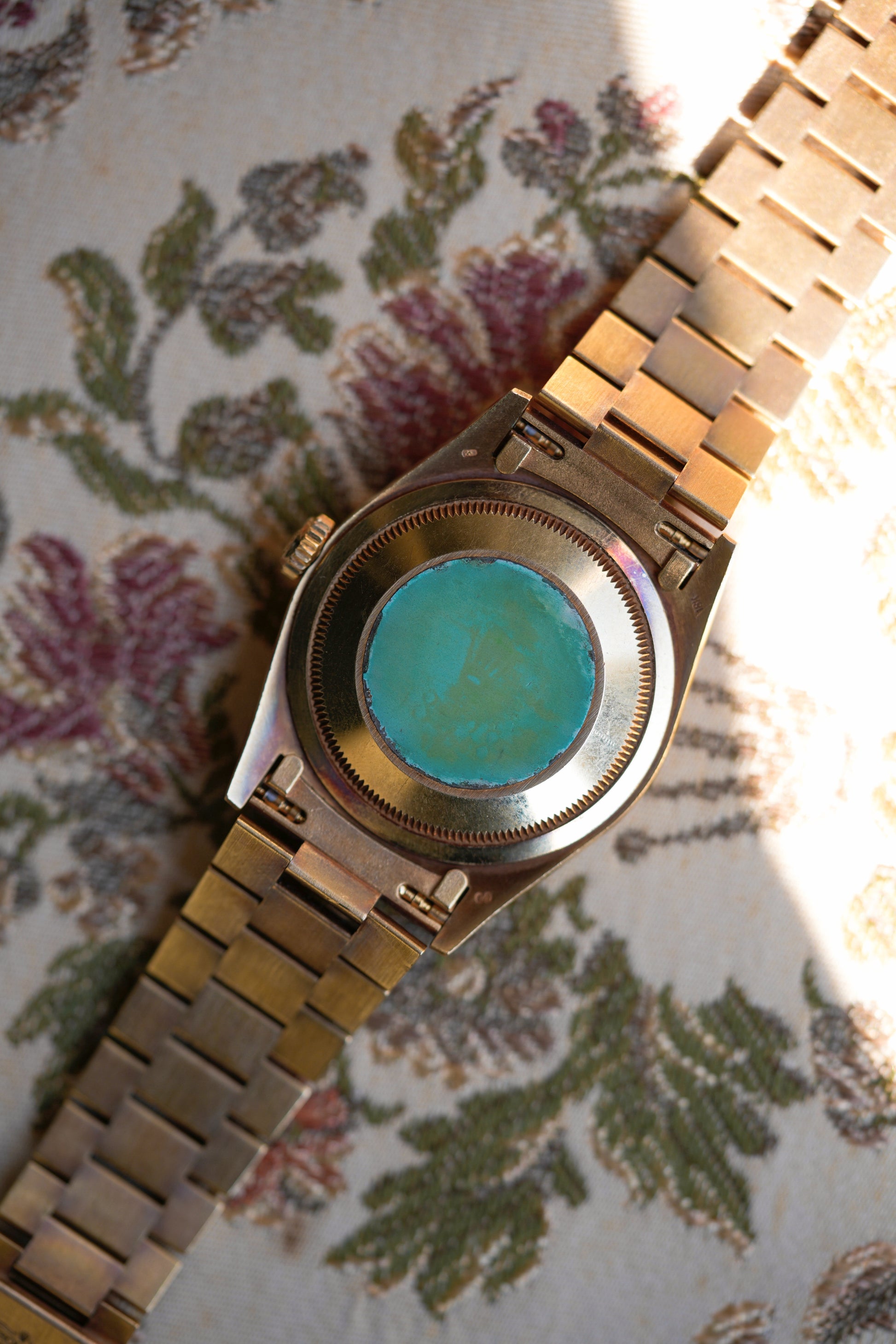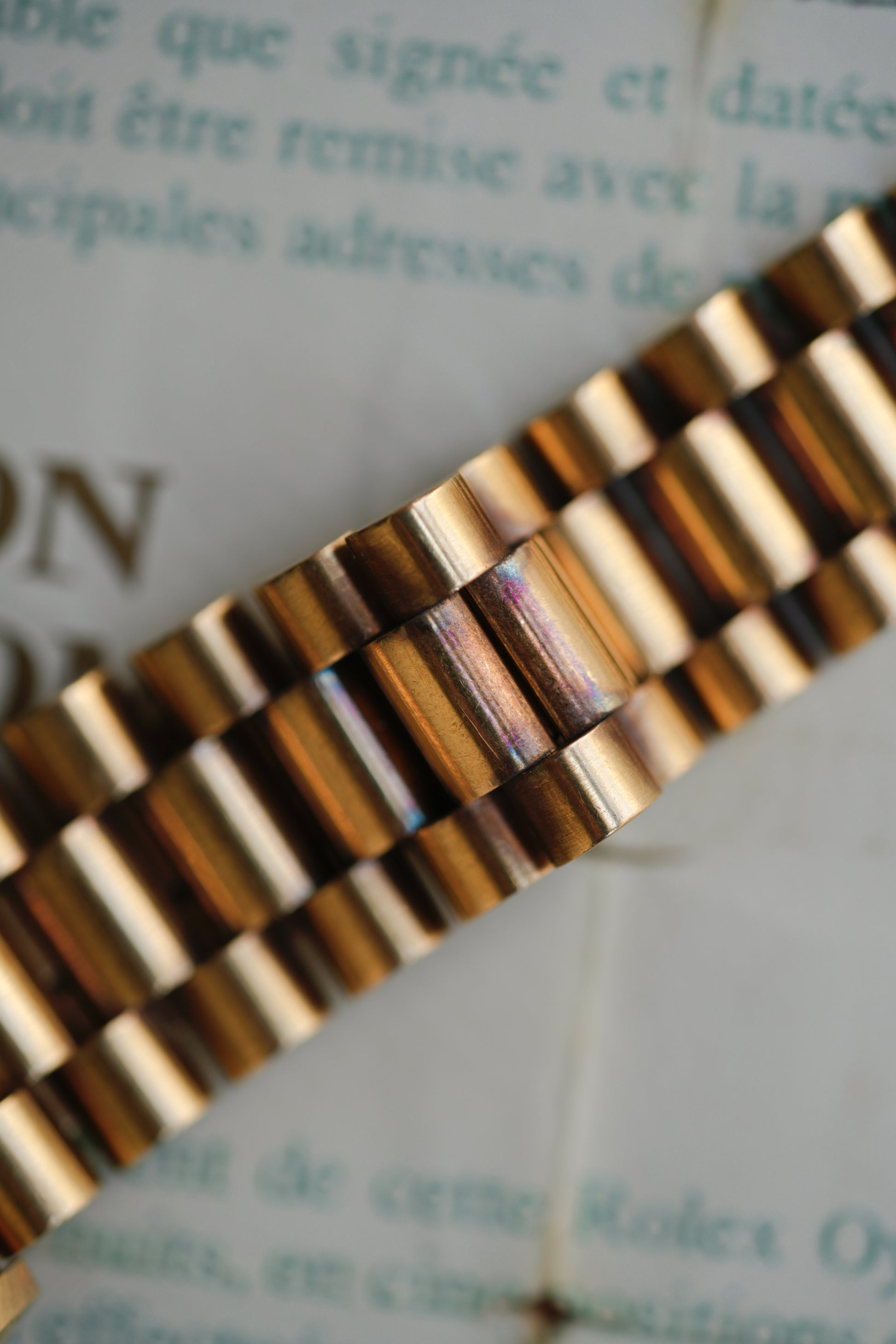 Unpolished 18ct yellow gold case and bracelet with a miraculous pink and purple oxidisation due to long period of storage in a safe box. Bracelet preserves a healthy position. Caseback maintains the factory green sticker bearing the reference. Complications include a quick-set day and date.