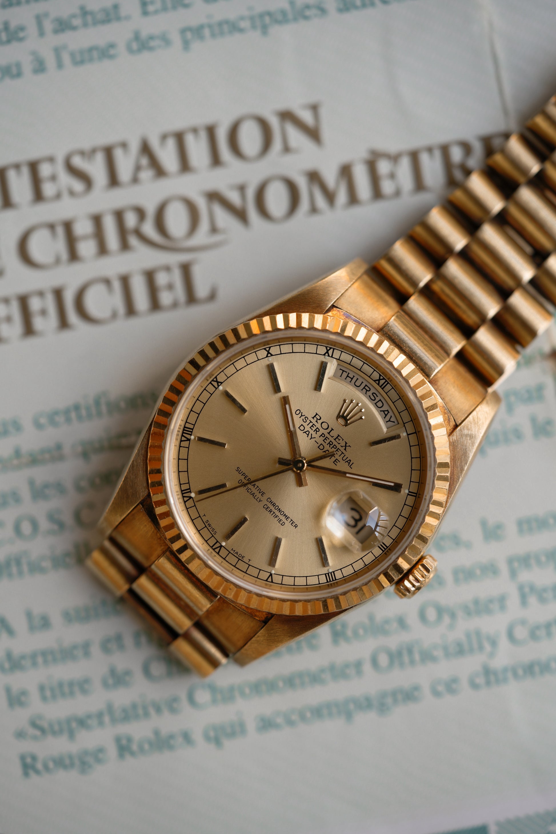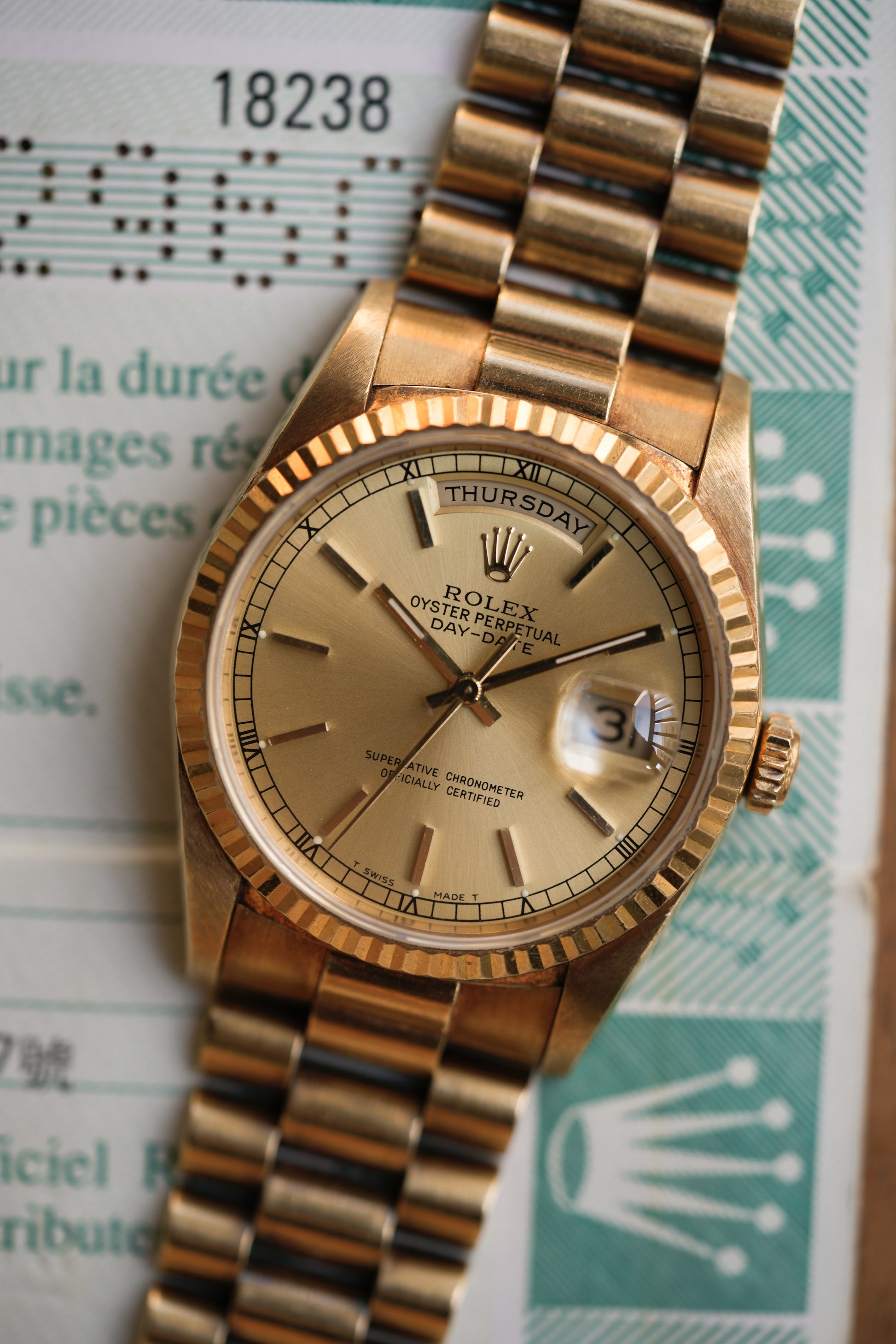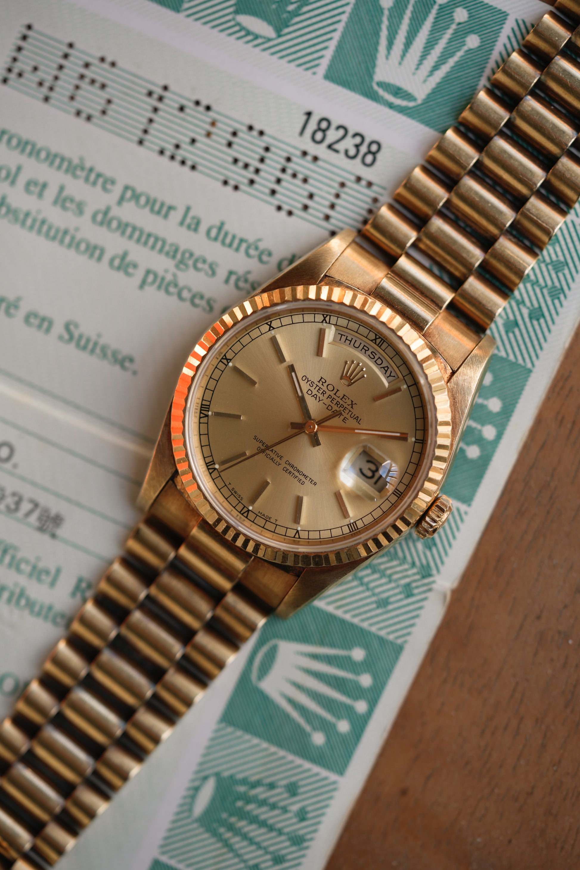 1995 Rolex Day-Date "President" Ref. 18238 – 36mm featuring a beautiful classic champagne sunburst dial.