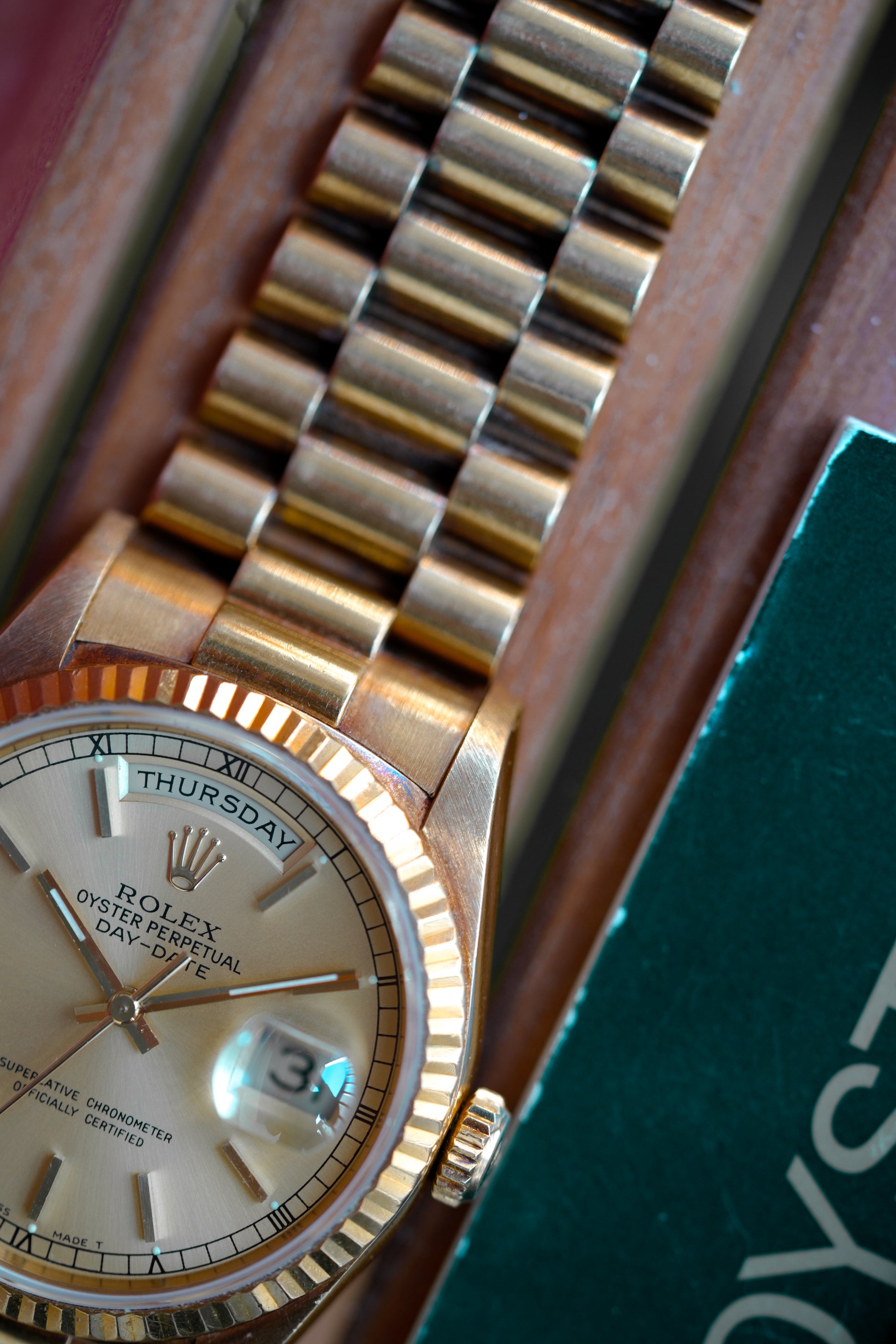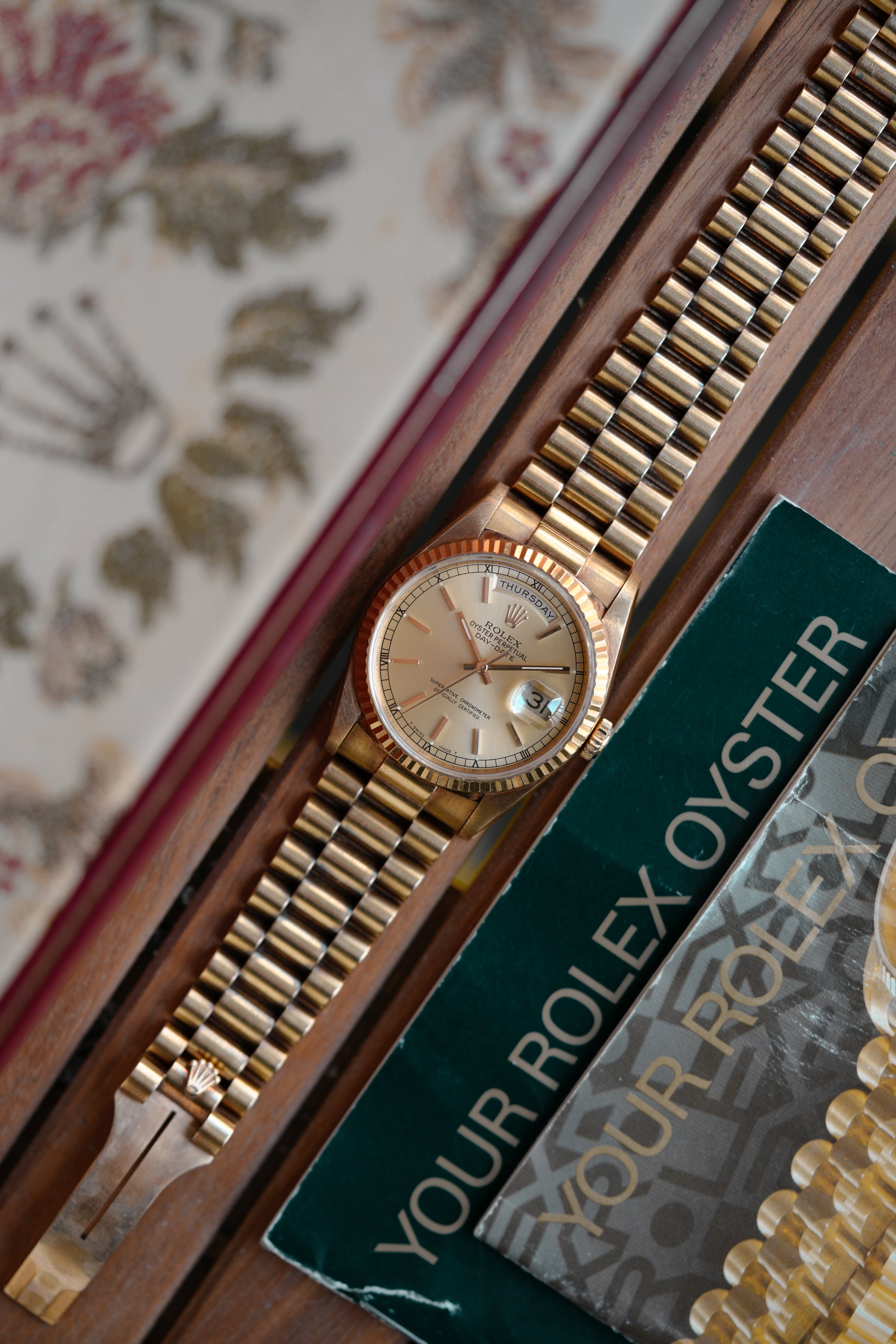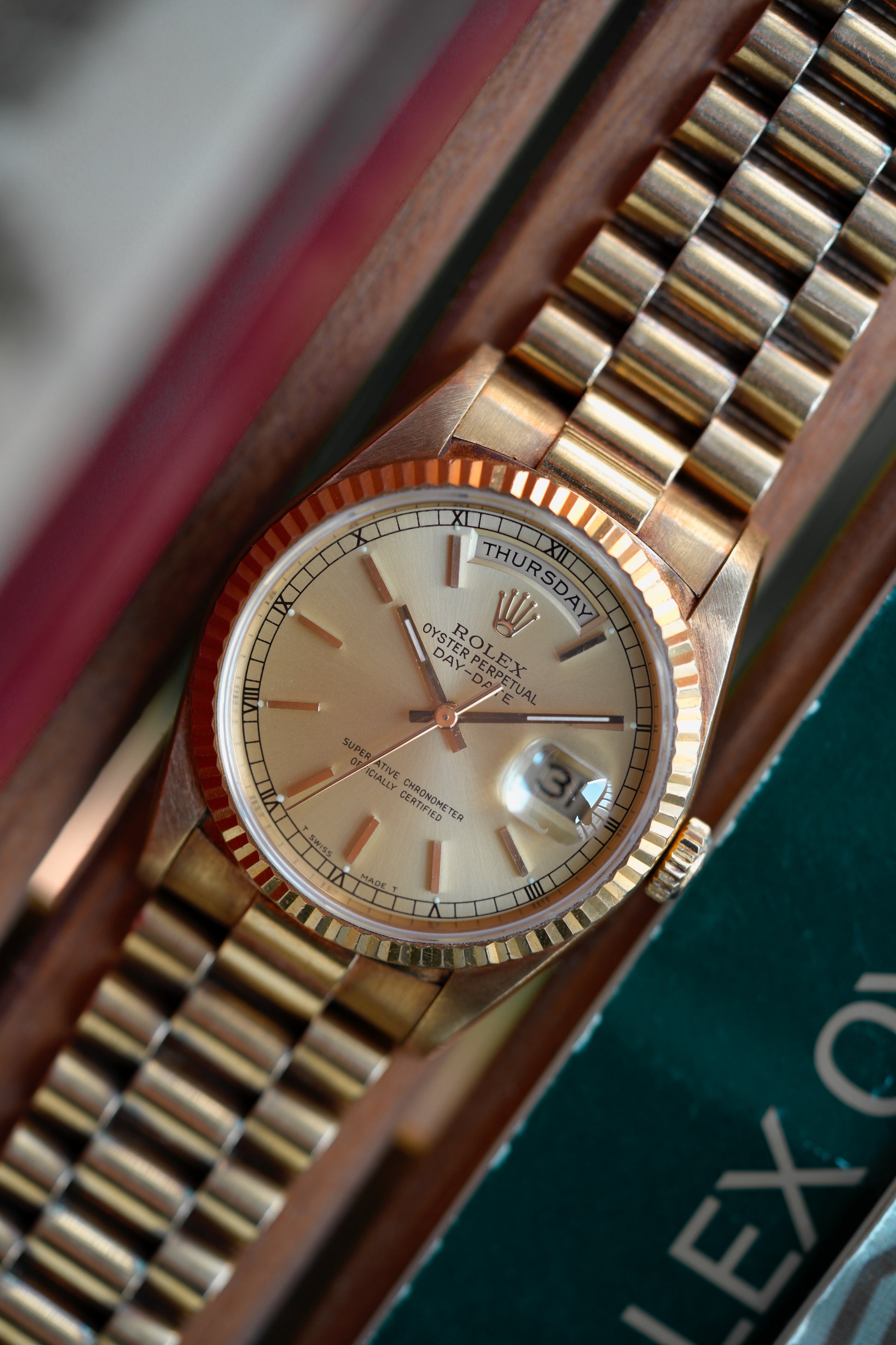 1995 Rolex Day-Date "President" Ref. 18238 – 36mm featuring a beautiful classic champagne sunburst dial.