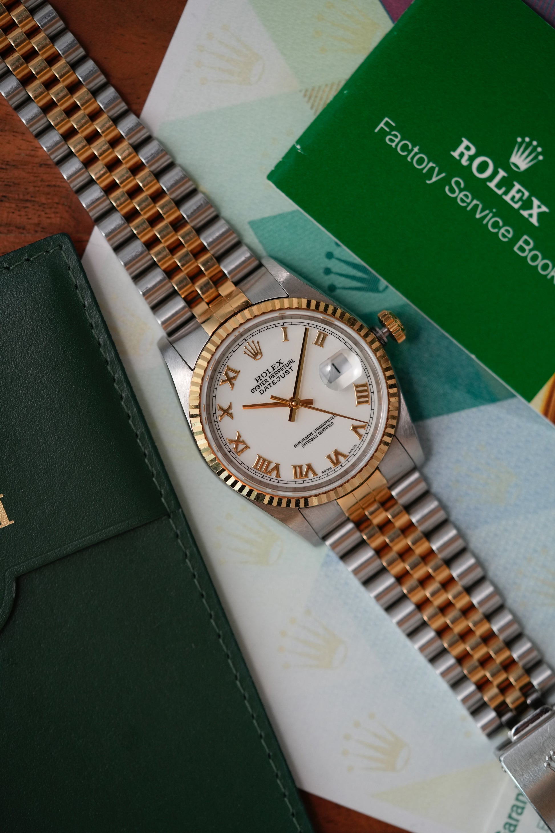 2007 Rolex Datejust Ref. 16233 – 36mm featuring a white Roman enamel dial. Retailed by Aramco in Saudi Arabia on January 07, 2007.